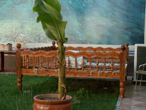 Der Innenhof wird dominiert von einem Range Rover, einem riesigen Freiluftbett (Caravot), was traditionell allerdings mehr zum entspannten Verweilen und gemeinsamen Essen dient... ca. 3 x 4 Meter und im Hintergrund des Bettes an einer Hauswand eine Fotowand ca. 8 x 10 Meter mit dem Bild einer griechischen Insel, Booten und Meer).