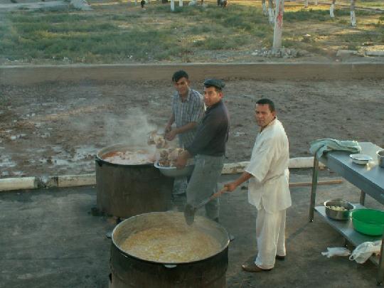 Ohnehin ist die Präsentation von Speisen in Restaurants und bei derartigen Anlässen eine interessante Sache. Da stehen neben den Getränken (große Cola und Wasserflaschen, Saft in Tetrapack) diverse kalte Platten auf dem Tisch, der sich in der Regel als zu klein erweist. Die Platten bestehen meist aus Käsescheiben (sehr lecker), Wurst (dito) schmackhaft eingelegten Gurken, angemachten Salaten (Kartoffel, Fleisch, Eier, Champignons, etc.) und kalten Braten (kaltes Lammfleisch --- super). Ebenfalls sind immer Früchte eingedeckt (Äpfel, Trauben, Birnen geschnitten mit Kernen, Bananen, Granatapfel, usw.) Serviert wird immer Tee. Meist grüner Tee. Je nach Art des Hauses oder Bestellung natur oder mit Zucker und einer ganzen Zitrone (schwimmend) zubereitet. Der wein zum Essen ist usbekisch süß